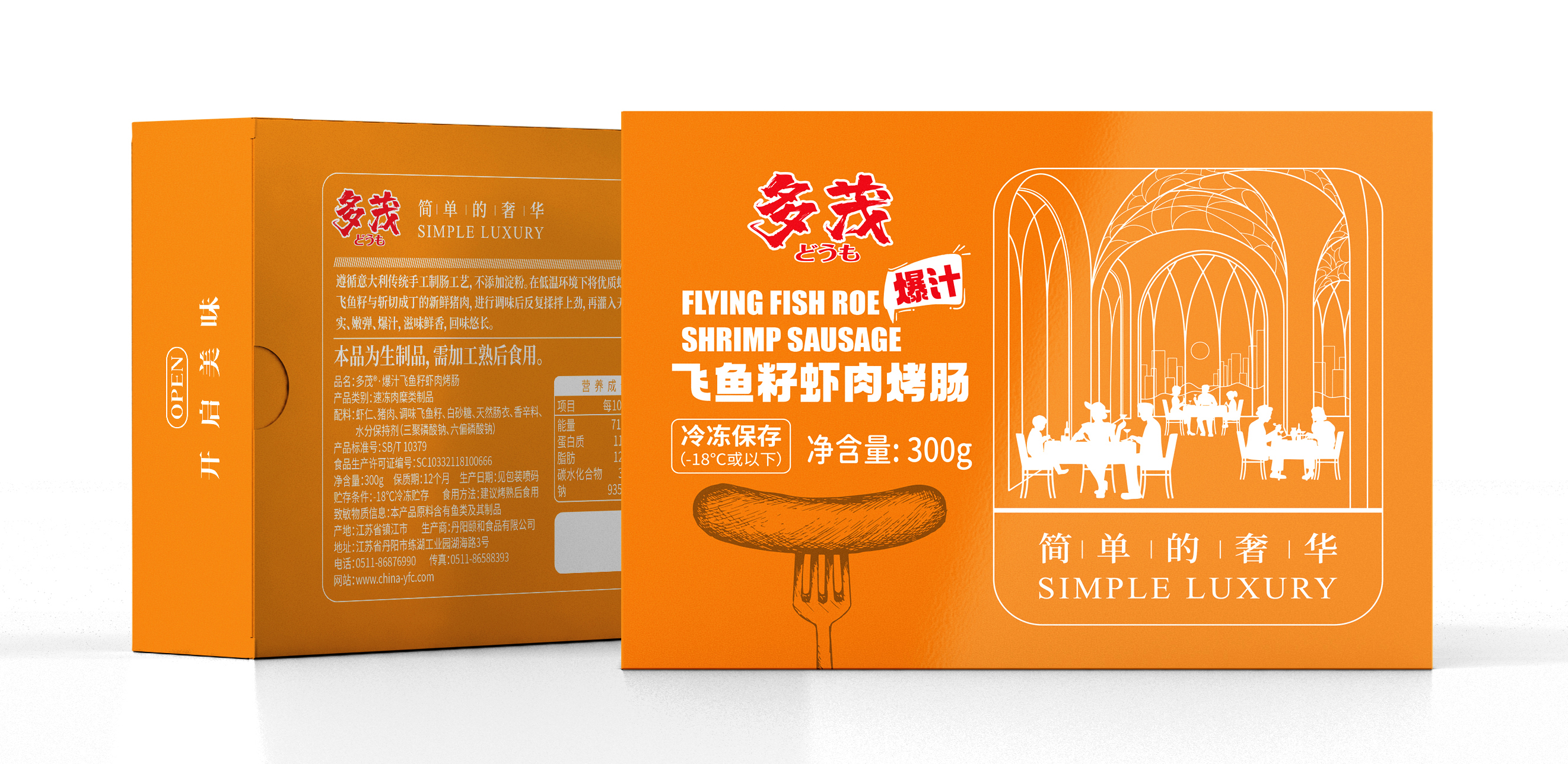 多茂爆汁飞鱼籽虾肉烤肠 遵循意大利传统手工制肠工艺,不添加淀粉。在低温环境下将优质虾肉打碎至起胶,加以适量的飞鱼籽与斩切成丁的新鲜猪肉,进行调味后反复揉拌上劲,再灌入天然肠衣中速冻制成。口感扎实、嫩弹、爆汁,滋味鲜香,回味悠长。