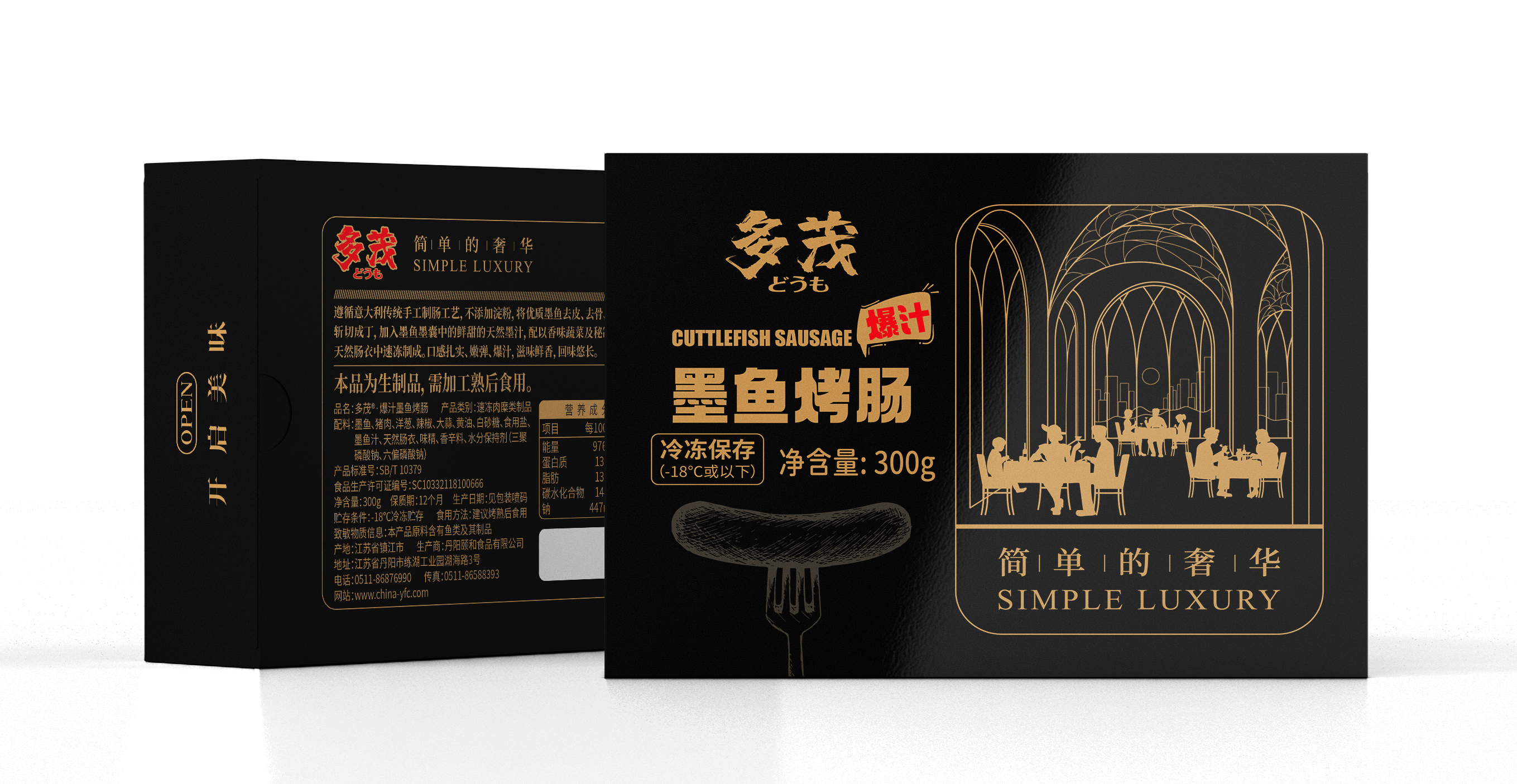 多茂爆汁墨鱼烤肠 遵循意大利传统手工制肠工艺,不添加淀粉,将优质墨鱼去皮、去骨、去除内脏后与新鲜猪肉一起斩切成丁,加入墨鱼墨囊中的鲜甜的天然墨汁,配以香味蔬菜及秘制香料反复揉拌上劲后,灌入天然肠衣中速冻制成。口感扎实、嫩弹、爆汁,滋味鲜香,回味悠长。
