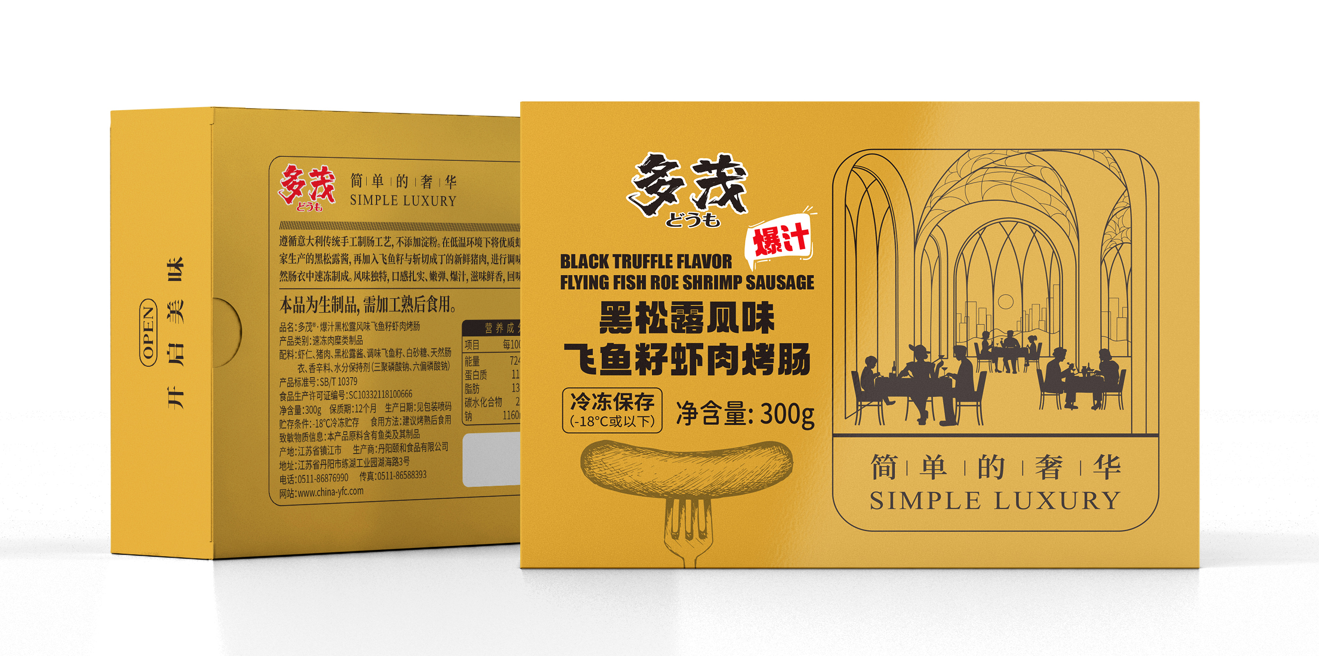 多茂爆汁黑松露风味飞鱼籽虾肉烤肠 遵循意大利传统手工制肠工艺,不添加淀粉。在低温环境下将优质虾肉打碎至起胶,加以适量的自家生产的黑松露酱,再加入飞鱼籽与斩切成丁的新鲜猪肉,进行调味后反复揉拌上劲,最后灌入天然肠衣中速冻制成。风味独特,口感扎实、嫩弹、爆汁,滋味鲜香,回味悠长。
